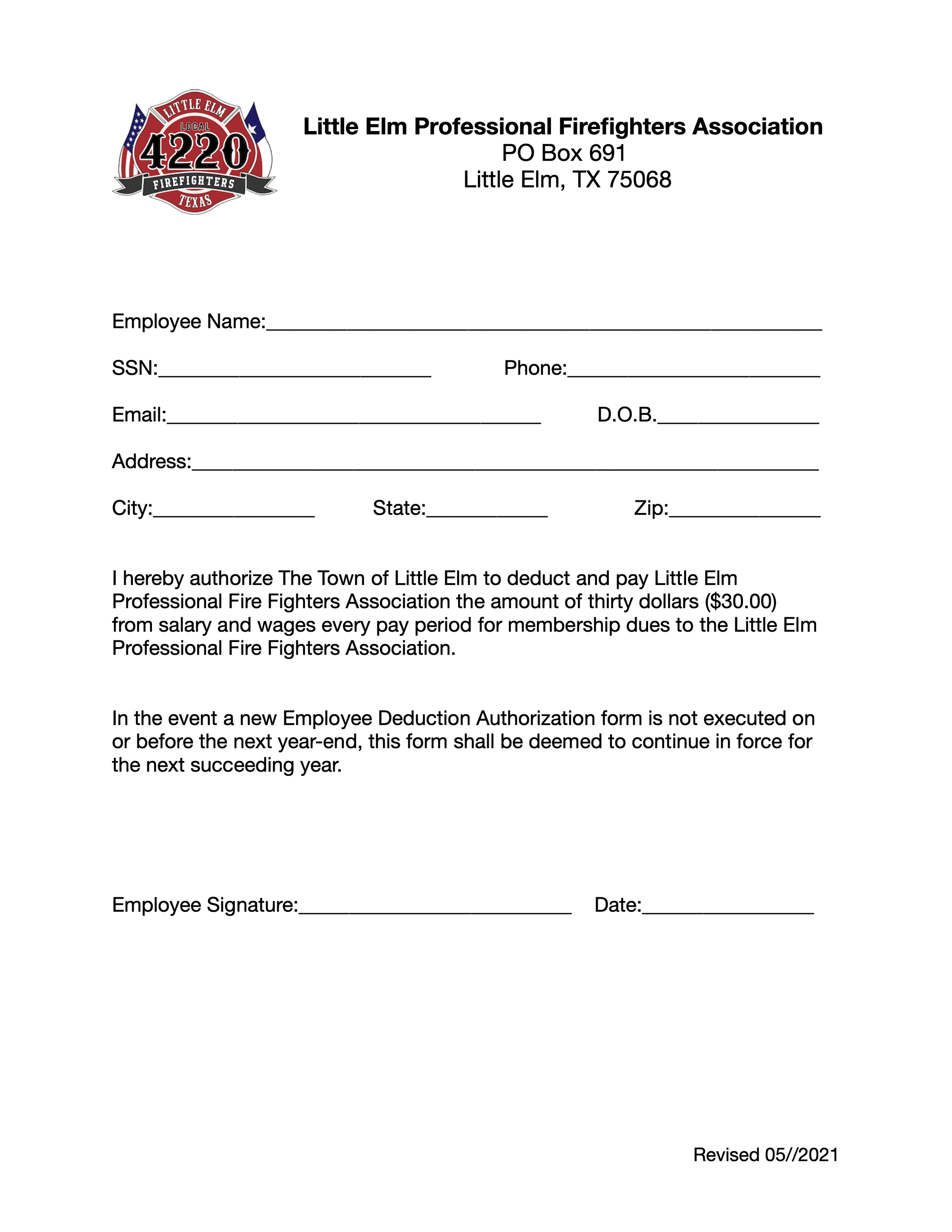 Please print out and fill this form and submit via email to president@littleelmfirefighters.org and to your HR (Human Resources) director.